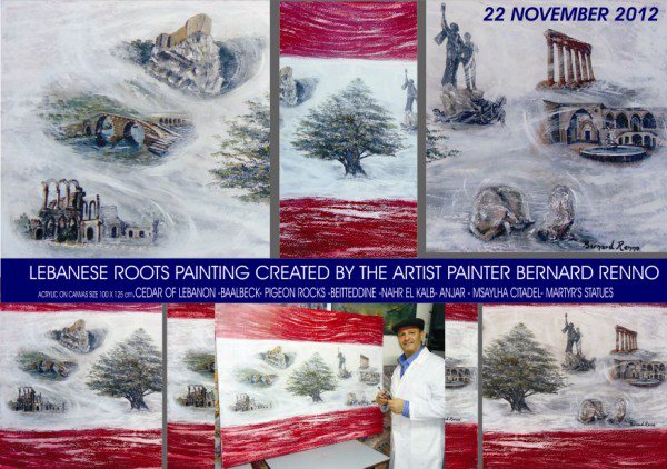 | LEBANESE ROOTS BY LEBANESE ARTIST BERNARD RENNO ACRYLIC ON CANVAS SIZE 100X125 CM . عيد الاستقلال بالالوان بريشة الفنان التشكيلي اللبناني برنار رنو _ جزور لبنانية بمناسبة عيد الاستقلال انجز الفنان التشكيلي اللبناني برنار رنو لوحة رمزية موضوعها العلم اللبناني بلونيه الاحمر و الابيض و تتوسطهما الارزة اللبنانية و يحيط بها معالم اثرية و تاريخية مثل تمثال الشهداء في وسط بيروت و اعمدة بعلبك و بيت الدين و صخرة الروشة وقلعة عنجر و نهر الكلب و قلعة المصيلحة اثار من كل المناطق اللبتانية سيقدمها الفنان برنار رنو للبنان عربون محبة ووفاء اللوحة بتقنية الاكليريك على القماش بمقياس 100ب 125 سنتمتر |